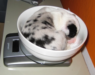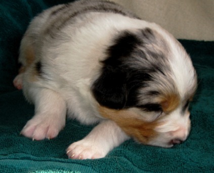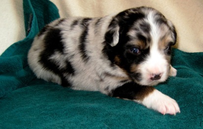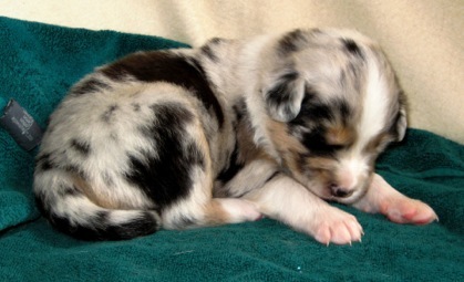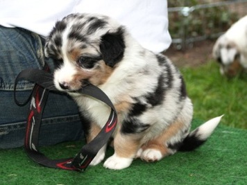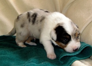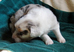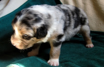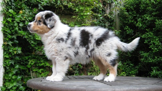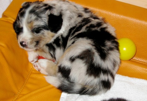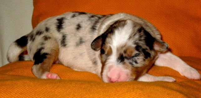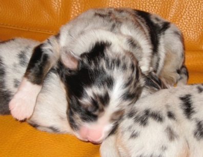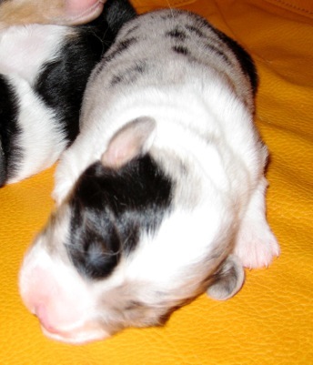 Ein heller Merle-Junge mit einem fantastischen Köpfchen: die rechte Gesichtsseite ist schwarz gezeichnet!
