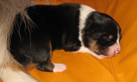 Hinten der Dritte im Bunde - ein ganz zarter Junge, der seiner Schwester sehr ähnlich ist; mit dem vielen Weiß der Mama und ihrem schwarzen Punkt auf dem Köpfchen.