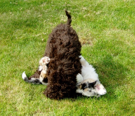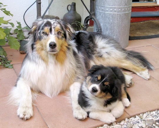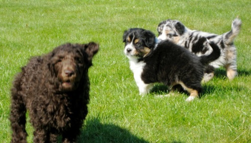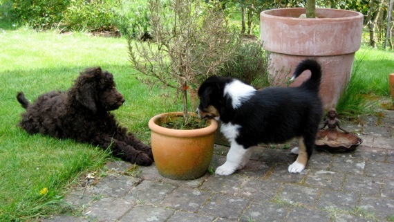 Inzwischen gibt es im Dorf weiteren hündischen Nachwuchs:Königspudel-Dame Bella ist genau drei Wochen älter als unsere Aussies und uns einen Besuch wert.