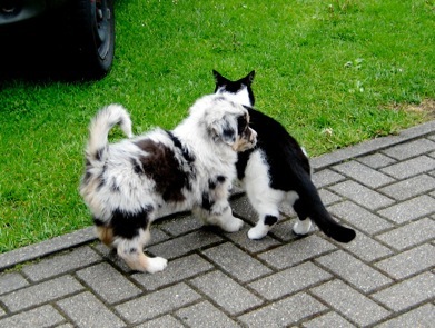Bislang hat unser Kater Sir Felix die Welpen nur beobachtet. Inzwischen haben sie aber eine Größe, die für ihn interessant ist.